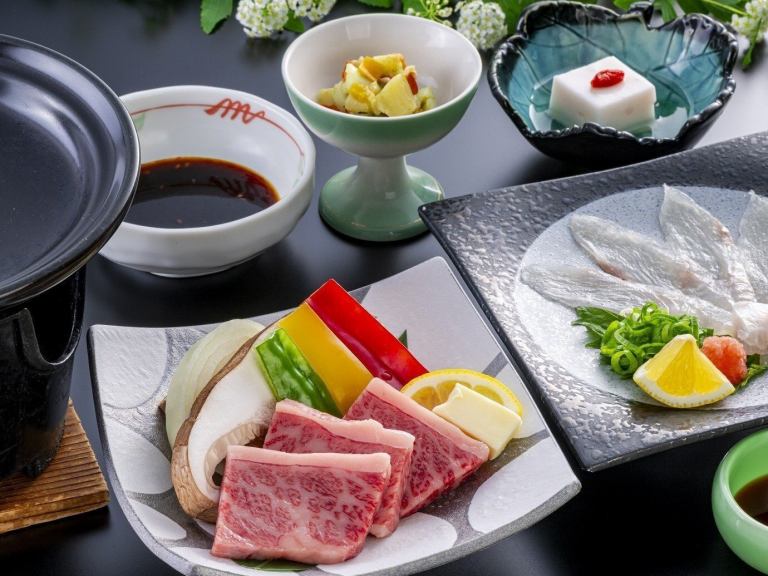 かぼすヒラメとおおいた和牛陶板焼